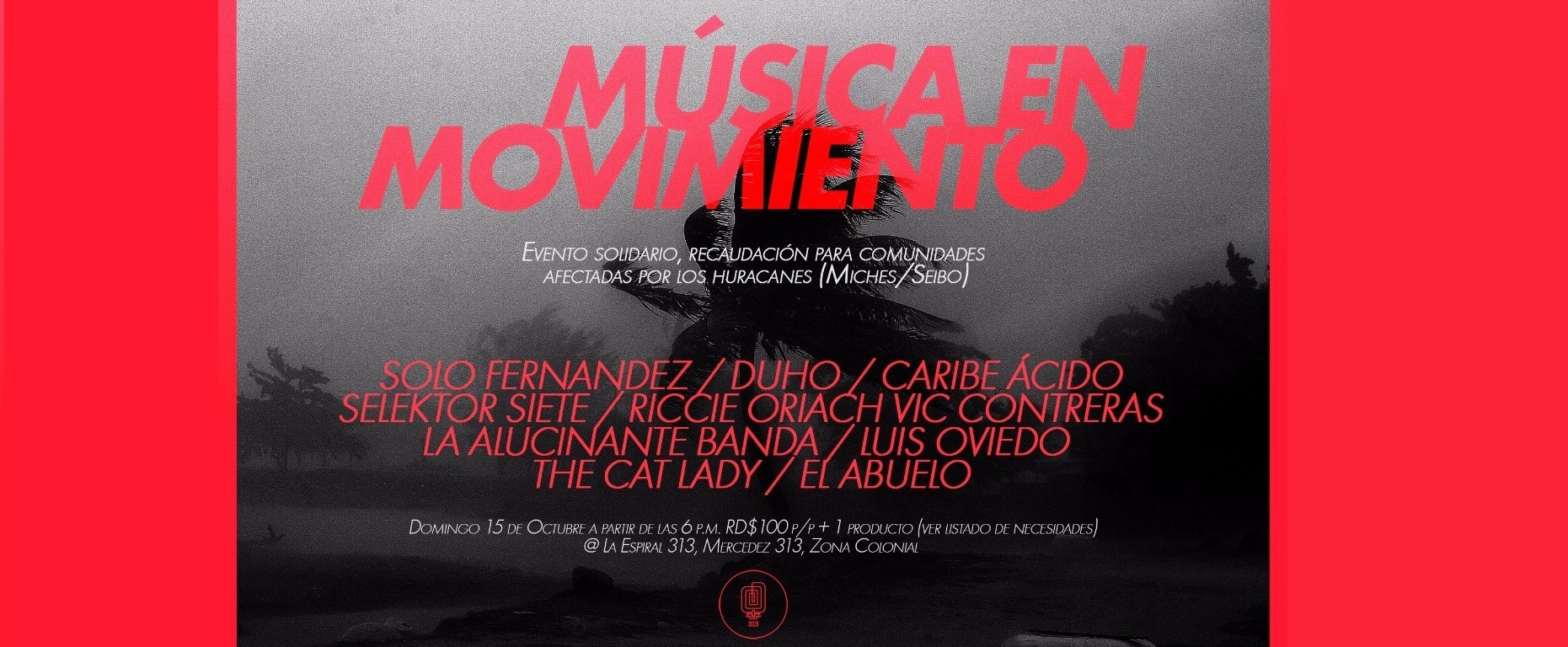 Ante esto, 9 proyectos de artistas, jóvenes la mayoría, ofrecerán su música para convocar al público y recaudar donaciones. Será el día domingo 15 de octubre a partir de las 6pm en La Espiral 313 (Mercedes 313, Zona Colonial). Participarán: Solo Fernández, DUHO de Felipe Auffant y Edgar Molina, Caribe Ácido, Riccie Oriach, Vic Contreras & La Alucinante Banda, Luitomá Oviedo, Selektor Siete, The Cat Lady y El Abuelo Gioel Martín. Una diversidad de propuestas para que todos los gustos estén cubiertos y todos los públicos se animen a participar. La entrada tiene un costo de $RD 100 más un producto (ver la lista de prioridades planteada por la comunidad).