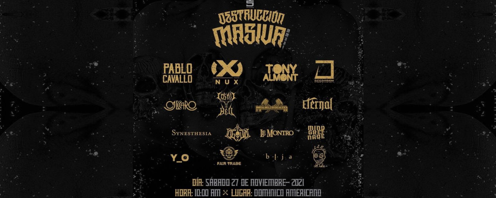 La décimo séptima edición del festival anual Destrucción Masiva, se celebrará el sábado 27 de noviembre de 2021 en el legendario auditorio del Instituto Cultural Dominico-Americano y contará con la participación de:
