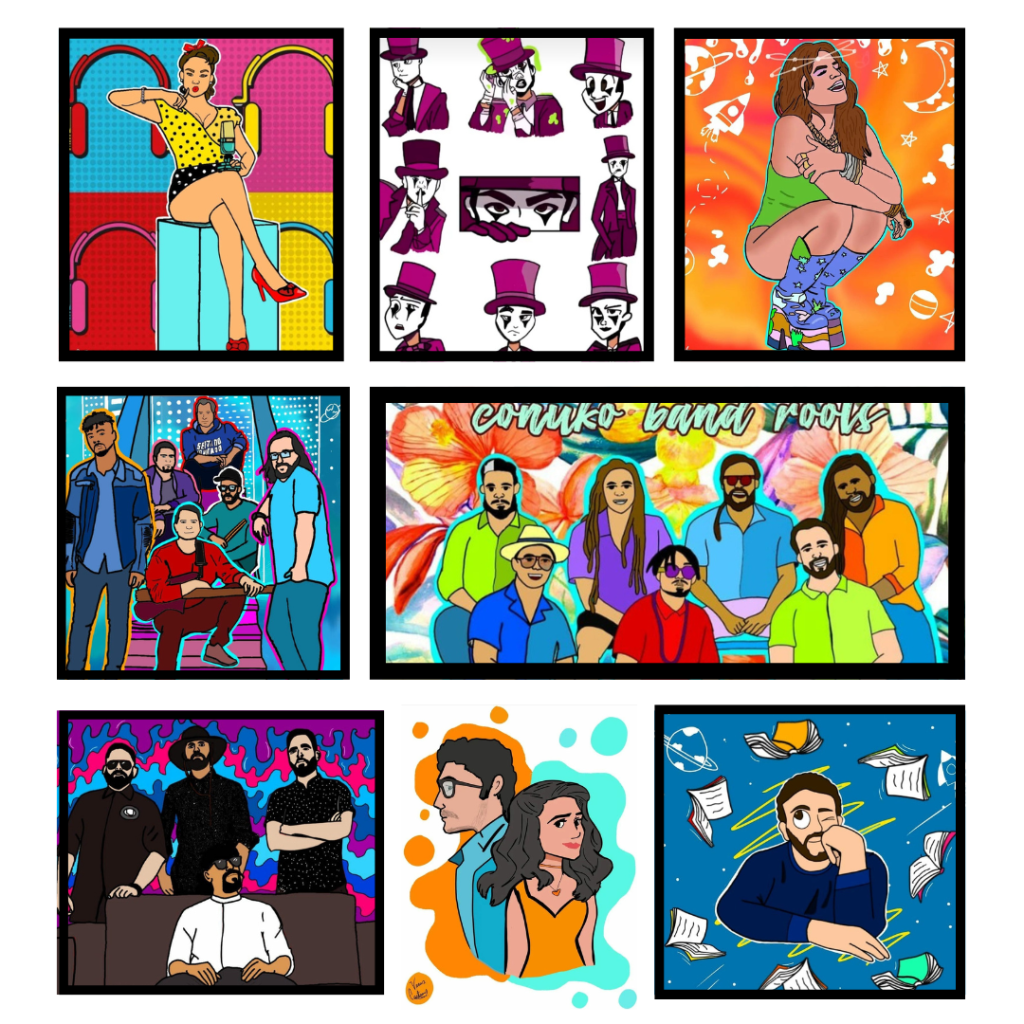 Eso ha sido un honor y un sueño hecho realidad, que tus artistas favoritos que tienes viendo y escuchando desde tu adolescencia disfruten de tu arte y que también quieran trabajar contigo es algo que yo a veces no me creo. O sea, yo con ‘Fan art a lo local‘ que son los dibujos que hago en honor a músicos locales, lo empecé porque quiero que la gente conozca a esos que han hecho y están haciendo historia con su música, o sea es como que historia de música local a través de dibujos, entonces yo nunca pensé que la serie me llevaría también a poder trabajar con la gran mayoría de artistas que he plasmado con mi arte. 💜