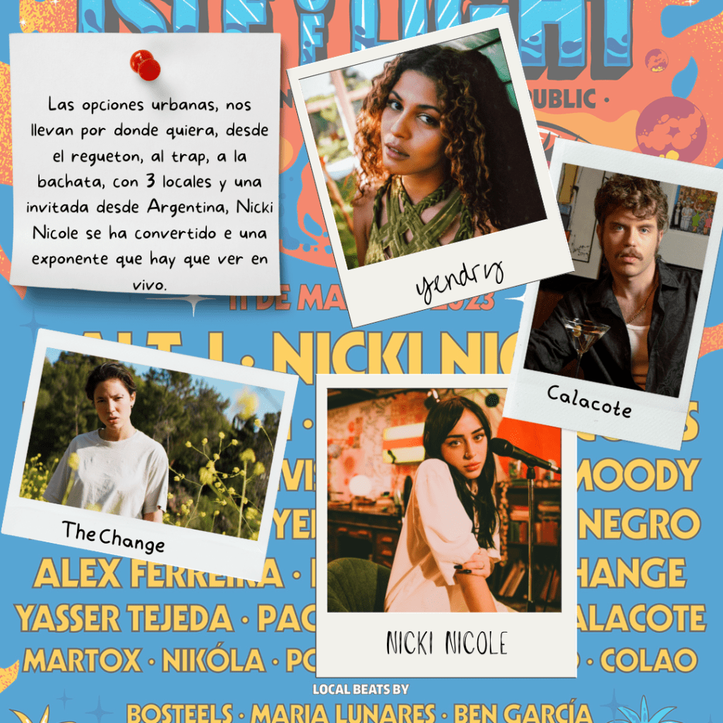 La selección local está de lujo. El cartel resalta mucho talento dominicano con sede en el extranjero, como el cantautor Alex Ferreira, Yendry, la cantante urbana The Change, Yasser Tejeda, y Calacote; sumándose proyectos alternativos locales como Martox, Colao, la cantante Nikola, el rock local representados por Poolpo y Le Montro, y los djs criollos Bosteels, Maria Lunares y Ben García, entre otros.