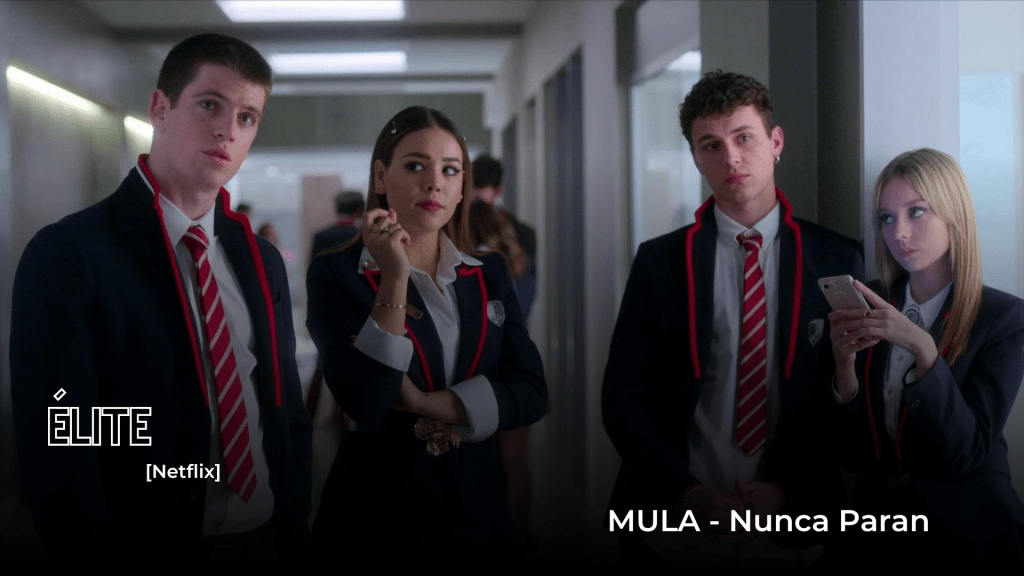 Y hablando de Rebelde, otra serie que lleva una idea similar sobre la vida de los jóvenes y centros estudiantiles poco tradicionales, es la serie española Élite. La serie narra la vida de un grupo de estudiantes del exclusivo colegio privado «Las Encinas», al que llegan tres nuevos alumnos becados de clase obrera, y donde las diferencias entre ricos y humildes dan lugar a un asesinato. La segunda temporada trata sobre la desaparición de un alumno del colegio y la tercera se centra en un nuevo asesinato entre los estudiantes. La cuarta temporada gira en torno a las nuevas reglas del colegio en el nuevo curso con la llegada de un nuevo director. En las cinco temporadas la historia se narra mediante saltos temporales provocados por flashbacks y flashforwards, en donde se mezcla la investigación policial y los hechos ocurridos. Si hay algo que es de elogiar de esta serie es la selección de canciones que acompaña la trama, en su mayoría bandas y artistas dentro del circuito ‘Indie’ y/o Alternativo, trayendo una oferta bastante interesante con canciones de The National, James Blake, C. Tangana, Dorian, La Casa Azul, Zahara, Joe Crepusculo, Ambar lucid, Wild Belle, Isabella Lovestory, sin olvidarnos de los toques urbanos Reykon, Ms Nina, Bad Gyal, Wost junto a Beatz Akademy y Nipo, y dentro de todo esto nos encontramos con el trío local MULA, quienes aparecen varias veces como en la temporada 2 con la canción ‘Nunca Paran’, y repiten en la temporada 4 con ‘Quiero que tú quieras’.