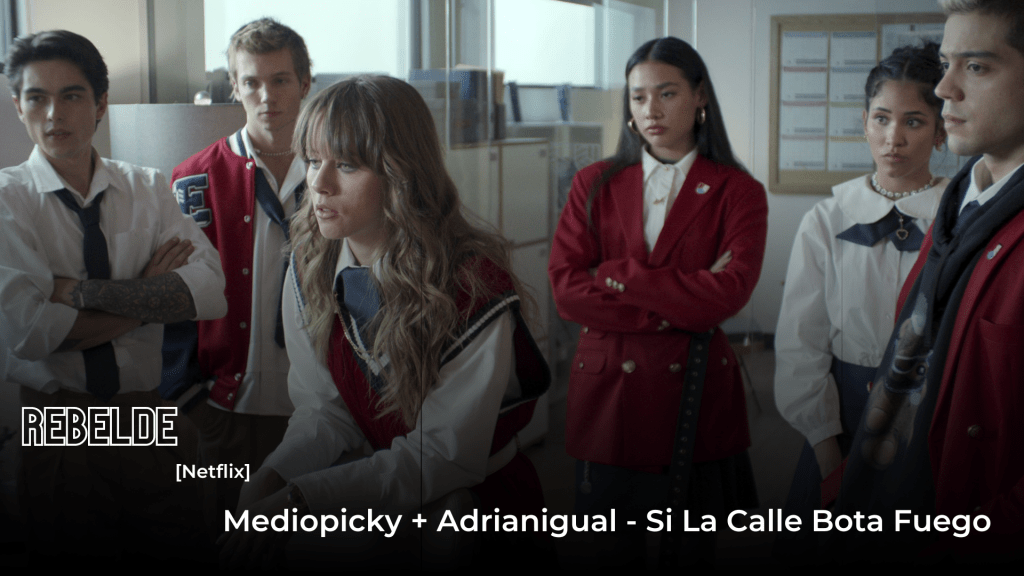Cuando se anunció que Netflix traería una nueva versión de la serie Rebelde a lo mejor no pensó que ya habíamos tenido demasiado tanto en su version argentina ‘Rebelde Way’, o la telenovela con el mismo nombre, pero los directivos explicaban que la serie seria una continuación de la telenovela mexicana Rebelde (2004-2006), que a su vez fue una adaptación de la serie argentina Rebelde Way (2002-2003). Y la sinopsis relata lo siguiente: otra generación de jóvenes estudiantes llega a la Elite Way School (EWS), ubicada en la Ciudad de México, para cumplir sus sueños musicales, pero primero tendrán que enfrentarse a un enemigo familiar: la Logia, una sociedad secreta. Para esta serie se contó con una banda sonora homónima en donde incluían reversiones de canciones de RBD, José José, Danny Ocean, Zoé, Jesse y Joy, Britney Spears y Selena, hechas por el elenco, pero lo que si impactá fue la lista de canciones que agregaron a sus episodios que le daban un toque actual y moderno, en donde encuentramos nombres como Nathy Peluso, ha$lopablito, Dua Lipa, Mitu, Tomasa del Real, Kali Uchis, Kordelya junto al dominicano irlandés Jame Minogue, Meth Math, Aj Davila, kablito, Rosa Pistola, y dentro de esta lista podemos escuchar la colaboración entre el productor y cantante Mediopicky junto al chileno Adrianigual con ‘Si La Calle Bota Fuego‘.