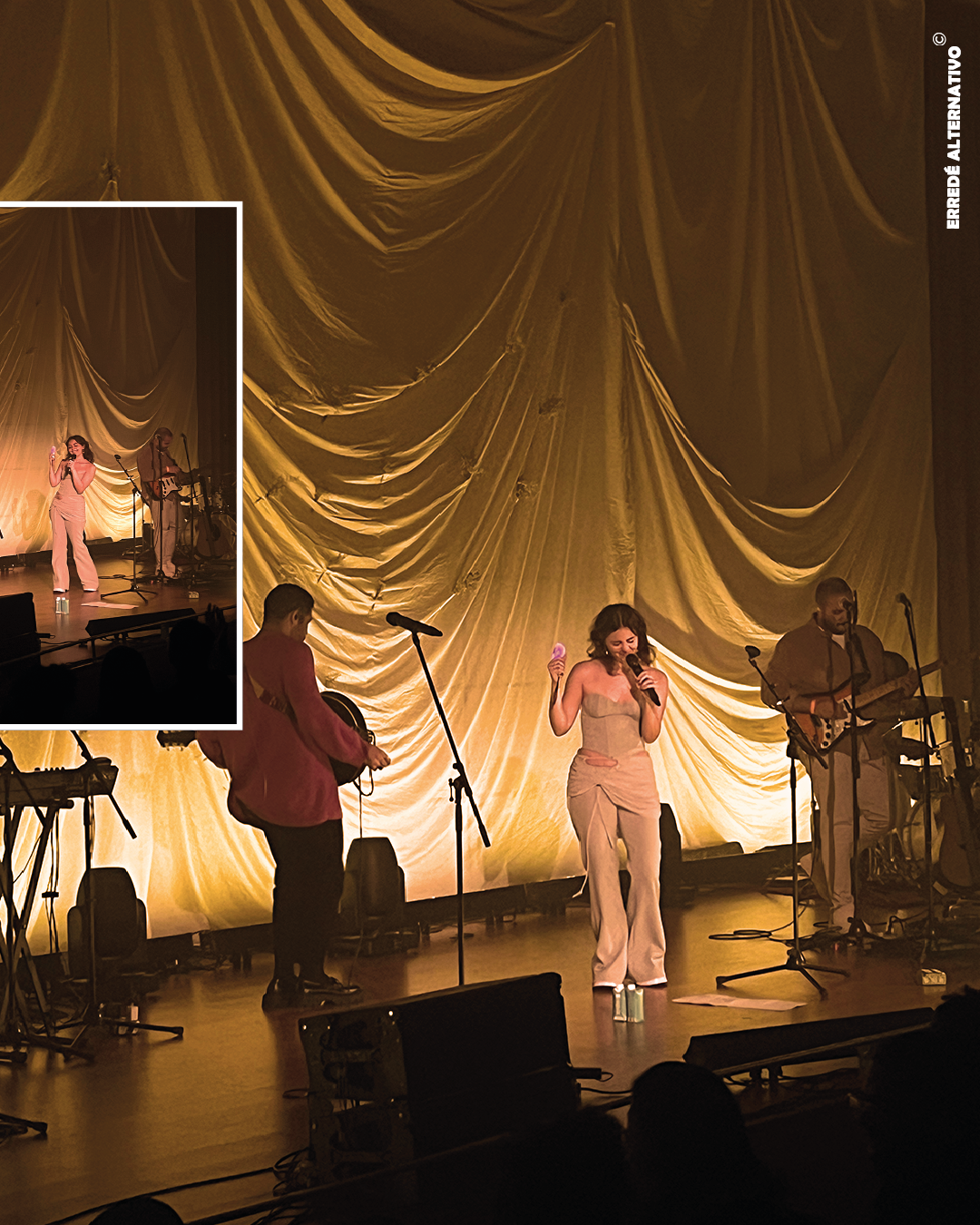 Minutos después, en medio de toda esa calma, las luces se apagaron de forma sutil y entran: Samuel Brea (baterista), seguido de Eduardo Jiménez (guitarrista), Dane Baret (tecladista), Mencía Reyes y Natacha Hernández (coristas), Helppi Smith (bajista) y, por último, la protagonista de la noche, SNENiE (guitarra y voz principal).