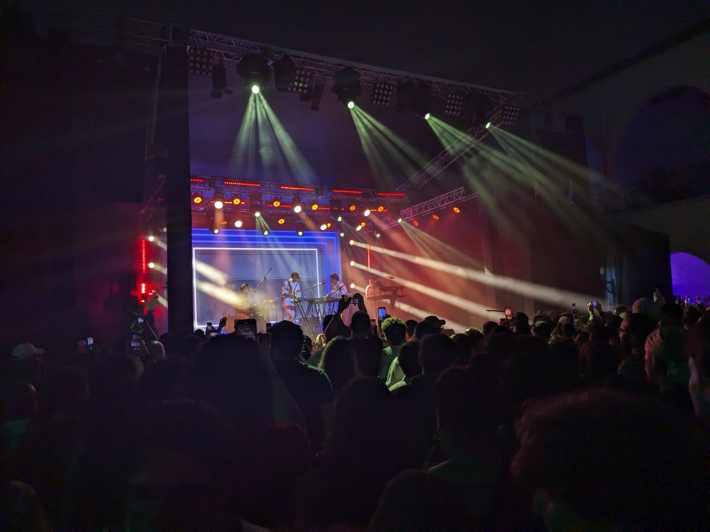 Y entonces, casi avisando la medianoche, llegó Clubz. El electropop de Monterrey calmó un poco los ánimos y, similar al inicio con Dhalias, nos metía en un trance musical acompañado de la simple visual de sus integrantes frente a un fondo de un “sol” en la pantalla LED del escenario que ocasionalmente cambiaba de color.