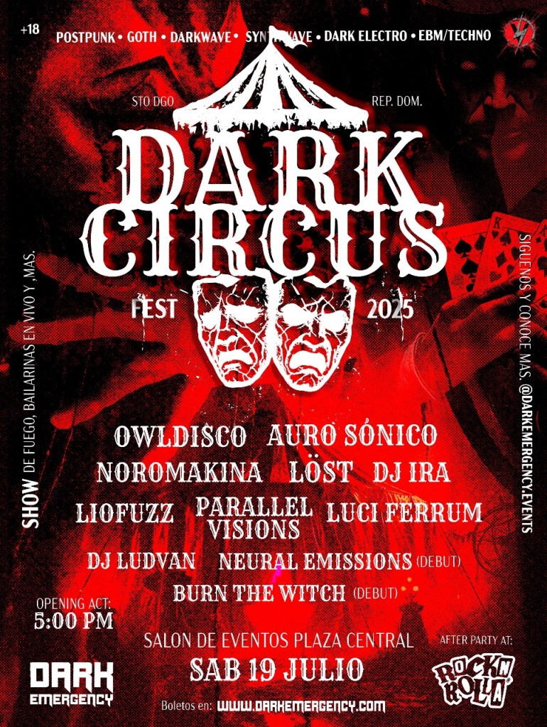 Cabe destacar que yo entiendo que al tener mezcla con música electrónica, nosotros estamos haciendo una apertura, no solamente el público rockero, sino también a la gente que le gusta la electrónica, pero también entiendo que mucha gente que no conoce el ambiente gracias a la visibilidad que estamos teniendo en las redes sociales con todas nuestras promos y entiendo que es un evento que vale la pena asistir para conocer nuevas propuestas. Es muy necesario siempre tener las propuestas frescas y algo que me hace muy orgullosa de esta edición, de la primera edición de Dark Circus, es que vamos a tener dos bandas debutando en nuestro evento. Entonces es algo que yo quisiera mantener, que por lo menos una banda nueva se pue estrenar y se siente confianza de debutar en nuestra plataforma. ¿Sabes? El tema del line-up se curó básicamente solo, o sea, como quien dice se cayó de la mata, porque es tercer evento que nosotros estamos organizando como Dark Emergency y el primer evento fue en Bogotá, que allá conectamos con los maravillosos Noromakina, el DJ Ira y otros artistas más que no pudimos traer para esta edición, pero la escena de Bogotá es demasiado rica. Entonces cuando nació la idea de hacer este festival de Dark Circus, nosotros tenemos una comunidad de artistas y músicos que nos apoyamos de una manera in-cre-í-ble, somos una red de personas que se apoyan, se impulsan, se ayudan, se quieren mucho y realmente peace and love pero gótico y era como lógico, o sea, ok, va fulano, va fulano, va fulano, vamos a traer fulano, fulano y fulano porque son nuestra gente. Entonces de camino también hemos hecho nuevas amistades y conocimos más artistas locales de hecho, y esta vez no lo pudimos agregar, pero lo tenemos en cue, es precioso porque pareciera que es un festival en República Dominicana, verdad? Pero nos están apoyando desde los Angeles, desde Miami, desde Bogotá, desde Madrid, desde Barcelona, desde Berlín, o sea, nosotros estamos en mira de mucha gente y muchos artistas de muchos lugares y es muy bonito, es muy bonito porque es lo que estamos haciendo, siento que estamos respaldados con una cantidad de buena vibra, que la gente quiere que eso funcione, la gente quiere que eso se dé bien y eso realmente es lo que nos impulsa hacia adelante.